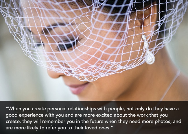 With this in mind, Evan strives to continue cultivating the relationships he has with his clients by sending out gifts after the event. Case in point: He sends newlyweds a gift for their one-year anniversary, such as a vivid metal print from MpixPro. The clients can see the value of this product by going to his website and seeing his prices and will fondly remember their big day and further appreciate him as the nice person he is.